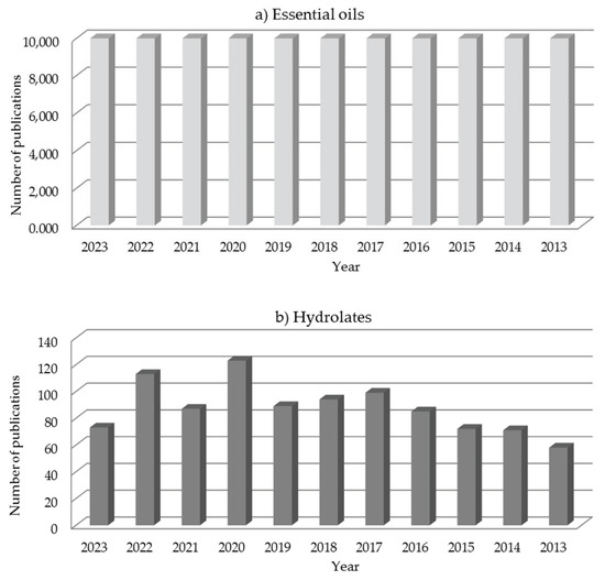 Number of publications per year on (a) essential oils and (b) hydrolates; obtained using search in Scopus database.