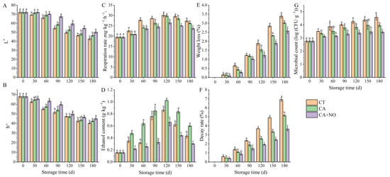 The evaluation of physiological attributes, such as color, respiration rate, ethanol content, weight loss and microbial count, is an integral part of maintaining fruit quality and storage life during postharvest storage, directly influencing its nutritional and economic value. The L* and h° of chestnuts in CT, CA and CA+NO groups all showed downward trends during the whole storage period (Figure 1A,B). By comparing different groups, it could be seen that the L* of CT was significantly lower than that of treated chestnuts from day 30 to day 180. However, there were no differences in the L* of chestnuts between the CA and CA+NO groups within 60 days. Since day 90, the L* of chestnuts from all groups all presented dramatic decreases; however, the values in the CA+NO group always maintained an obviously higher level than those in the CA alone and CT groups (Figure 1A). The h° in CA+NO was 5.0–16.1% and 1.5–10.5% higher than those in CT and the CA alone, respectively, during the whole storage period, indicating more effective and immediate effects of the combination treatment on fresh chestnuts (Figure 1B).