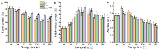Effects of CA and CA+NO on starch content (A), soluble sugar content (B) and amylase activity (C) of chestnuts during 180 days of storage at 0 °C. Different letters indicate significant differences between CT, CA and CA+NO within the same time point (p < 0.05).