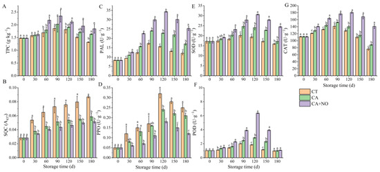 Effects of CA and CA+NO on TPC (A), SQC (B), PAL (C), PPO (D), SOD (E), POD (F) and CAT (G) of chestnuts during 180 days of storage at 0 °C. Different letters indicate significant differences between CT, CA and CA+NO within the same time point (p < 0.05).