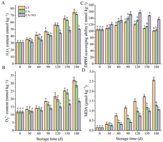 Effects of CA, CA+NO on H2O2 content (A), O2•− content (B), DPPH scavenging ability (C) and MDA content (D) of chestnuts during 180 days of storage at 0 °C. Different letters indicate significant differences between CT, CA, CA+NO within the same time point (p < 0.05).