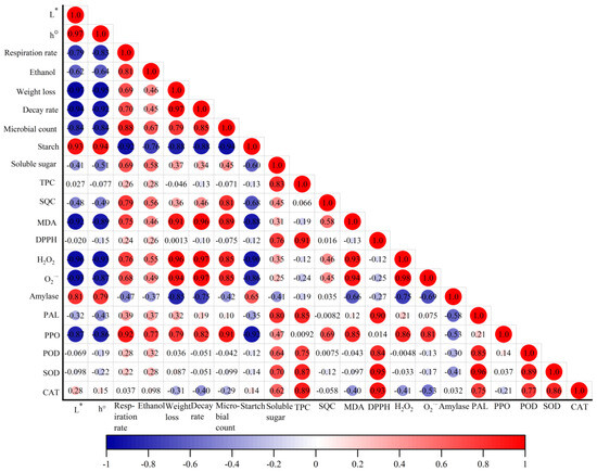 Pearson’s correlation coefficients for quality attributes of chestnuts, including L*, h°, respiration rate, weight loss, decay rate, microbial count, ethanol content, starch content, soluble sugar content, TPC, SQC, MDA, DPPH scavenging ability, H2O2, O2− and PAL, PPO, SOD, POD, CAT and amylase. The red and blue colored dots are positive and negative correlations respectively, and the number presented is the correlation coefficient.