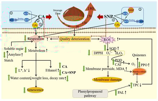 Schematic overview of regulation mechanism of CA alone or in combination with NO for storage quality in chestnuts. Green arrow indicates up- or downregulation in response to CA alone or in combination with NO. Black arrow indicates up- or downregulation in response to CT.
