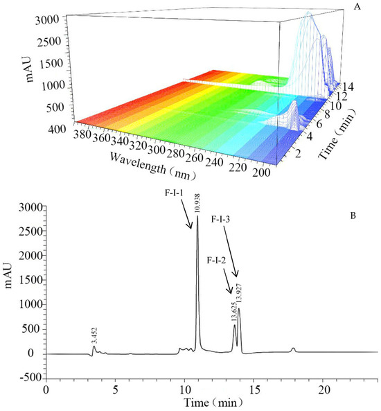 In order to determine the characteristic absorption wavelength of 5′−NT, fraction F−I was scanned with a diode array detector (DAD, Figure 2A). The signal values reported in Figure 2A indicate obvious absorption peaks for 5′−NT at wavelengths between 190–250 nm and 265–295 nm, the highest absorption intensity being recorded at 220 nm. Therefore, 220 nm was chosen as the characteristic absorption wavelength for 5′−NT. Based on this wavelength, 5′−NT was separated and purified using RP−HPLC (Figure 2B). The results in Figure 2B indicate that there were three sub−fractions in F−I. The specific enzyme activities in sub−fractions F−I−1, F−I−2, and F−I−3 were measured to be 41.19 ± 1.98 U/g protein, 5.39 ± 0.28 U/g protein, and 5.21 ± 0.32 U/g protein (Table 1), respectively. The specific enzyme activity in F−I−1 was significantly (p < 0.05) higher than those in F−I−2 and F−I−3. Therefore, fraction F−I−1 was collected through enriching and freeze−drying processes and further used as purified 5′−NT.
