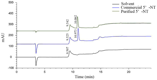 In order to verify the purity of the prepared 5′−NT, the purified compound was compared with the selected commercial 5′−NT using RE−HPLC (Figure 3). The results in Figure 3 show that the purified and commercial 5′−NT had positive peaks at 10.862 min and 10.973 min, respectively. The relative retention time of the former (10.863 − 9.542 = 1.32) was shorter than that of the latter (10.973 − 9.525 = 1.448). According to the principle of chromatographic separation, it can be inferred that the molecular weight of the purified 5′−NT is likely to be smaller than that of the commercial counterpart. To confirm this speculation, the molecular weights of both compounds were measured with SDS−PAGE (Section 3.1.4).