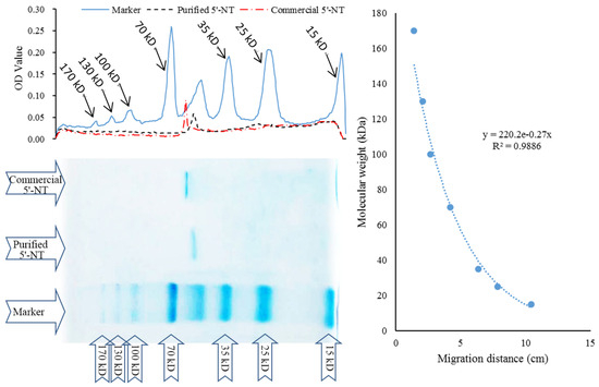 SDS−PAGE and the linear regression method were used to determine the molecular weight of the purified 5′−NT [24], and the results are shown in Figure 4. According to the regression equation, the calculated molecular weights of the purified and commercial 5′−NT were 57 kDa and 61.6 kDa, respectively. This result is consistent with that of the relative retention time of the compounds, which was shorter for the purified compound than for the commercial counterpart (see Section 3.1.3).