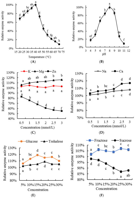 Enzymatic properties of the purified 5′−NT. Values are presented as mean ± standard deviation. Different letters above the bars or points highlighting the standard deviation indicate significant differences (p < 0.05). (A) Effect of temperature on activity of 5′−NT; (B) Effect of pH on activity of 5′−NT; (C) Effect of K+, Mg2+ and Zn2+ concentration on activity of 5′−NT; (D) Effect of K+, Na+ and Ca2+ concentration on activity of 5′−NT; (E) Effect of glucose and trehalose concentration on activity of 5′−NT; (F) Effect of fructose and sucrose concentration on activity of 5′−NT.