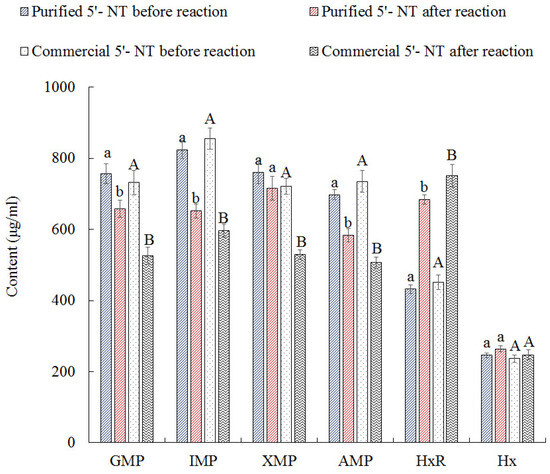 To verify the hydrolysis effect of the purified 5′−NT, both the purified compound and its commercial counterpart were used to hydrolyze nucleotides (GMP, IMP, XMP, AMP, HxR, and Hx), and the obtained results are shown in Figure 6. After hydrolysis, the contents of GMP, IMP, and AMP decreased significantly (p < 0.05), while the content of HxR increased significantly (p < 0.05), and the content of Hx showed no significant (p > 0.05) increase. The content of XMP did not decrease significantly (p > 0.05) when treated with the purified 5′−NT, but it did when treated with the commercial compound. These results suggest that the purified 5′−NT has weak hydrolytic activity towards XMP. After hydrolysis with the purified 5′−NT, the contents of GMP, IMP, XMP, and AMP decreased by 12.96%, 20.98%, 5.96%, and 16.34%, respectively; after hydrolysis with the commercial 5′−NT, they decreased by 28.27%, 30.35%, 26.63%, and 31.14%, respectively. These results indicate that the purified compound has a hydrolysis effect similar to that of the commercial one with two exceptions: its hydrolysis activity against IMP is higher, and that against XMP is lower than that of the commercial 5′−NT tested.