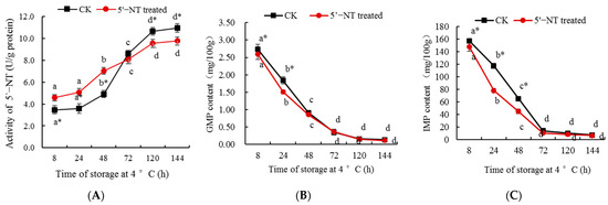 The treatment group included samples supplemented with 5′−NT and allowed to stand, which may be the reason why 5′−NT activity in the treatment group was higher than that in the control at 8 h, 24 h, and 48 h (Figure 7A). On the contrary, 5′−NT activity in the treatment group was lower than that in the control at 120 h and 144 h (Figure 7A), which indicates that with the increase in storage time, the high content of 5′−NT accelerated the metabolism of nucleotides in the meat, leading to a large depletion in 5′−NT. The contents of GMP, IMP, and AMP in the 5′−NT−treated group were lower than those in the control (Figure 7B,C,E), indicating that the high content of 5′−NT in the treatment group at 8 h, 24 h, and 48 h accelerated the metabolism of these compounds. The content of XMP showed no significant (p > 0.05) differences between the 5′−NT−treated and control groups at 8 h, 24 h, 48 h, 72 h, 120 h, and 144 h (Figure 7D), indicating that the degradation activity of 5′−NT against XMP was not high (Figure 6). According to nucleotide metabolic pathway [36], after having been degraded by 5′−NT, IMP produces HxR, which is further hydrolyzed to produce Hx. At 8 h, 24 h, and 48 h, 5′−NT activity in the treatment group was significantly (p < 0.05) higher than that in the control, resulting in more IMP being converted into HxR, thus further resulting in the content of HxR in the 5′−NT−treated group being significantly (p < 0.05) higher than in the control at 8 h, 24 h, and 48 h (Figure 7F). At 72 h, 120 h, and 144 h, there were no significant (p > 0.05) differences in the content of HxR between the 5′−NT−treated group and the control (Figure 7F), indicating that the degradation of HxR resulted in an accumulation of Hx in the 5′−NT−treated group, which led to the content of Hx in the 5′−NT−treated group being higher than that in the control at 24 h, 48 h, 72 h, 120 h, and 144 h (Figure 7G).