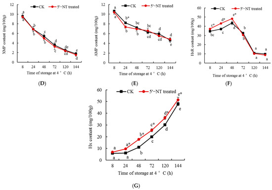 Effects of 5′−NT on the content of nucleotides of the pork stored at 4 °C. Values are presented as mean ± standard deviation. Different letters above the bars or points highlighting the standard deviation indicate significant differences (p < 0.05). “*” represents significant differences between groups (p < 0.05). (A) Effect of storage time on activity of 5′−NT; (B) Effect of storage time on content of GMP; (C) Effect of storage time on content of IMP; (D) Effect of storage time on content of XMP; (E) Effect of storage time on content of AMP; (F) Effect of storage time on content of HxR; (G) Effect of storage time on content of Hx.
