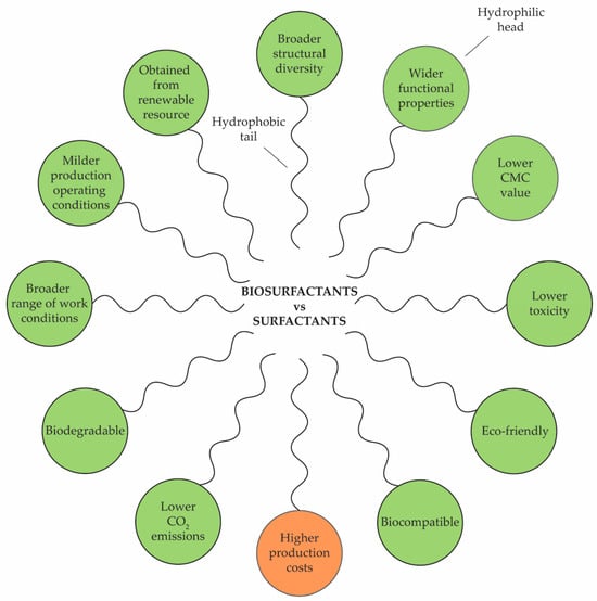 The broader compositional diversity of biosurfactants over surfactants can be attributed to the raw material they are being produced from, leading to another classification, which divides synthetic surfactants from natural or “green” surfactants (biosurfactants). The majority of synthetic surfactants are obtained in the petrochemical sector from non-renewable sources []. On the other hand, biosurfactants can be obtained from plants and animals in chemical (extractions, precipitation, or distillation) or enzymatic processes, as well as metabolism products of bacteria, yeast, and fungi when cultivated (fermented) on different renewable resources []. In terms of the United Nations sustainable development goals in building a green economy, biosurfactants are obviously favored as products generated in a sustainable fashion due to utilizing renewables.