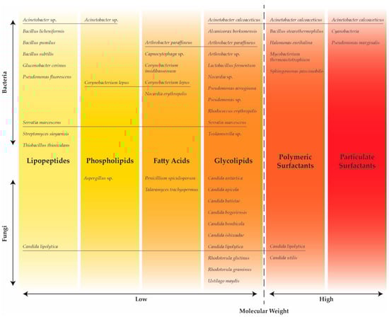Besides their diverse chemical composition, biosurfactants can be produced by a wide variety of distinct microorganisms. These metabolites are produced as secondary (in the stationary growth phase) extracellular compounds roaming freely in the cultivation medium or remain attached to the microbial cell surface []. Additionally, the producing microorganisms have the ability to synthesize a wide range of biosurfactants concerning their molecular weight, which can vary from low to high. The broad variety of biosurfactants regarding their microbial origin, chemical structure, and molecular weight is presented in Figure 2.