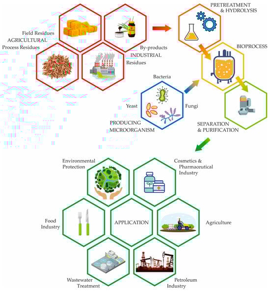 Regarding the potential development of agro-industrial residue, waste, by-product, or wastewater valorization processes, it is important to systematically evaluate the production process and characteristics of agro-industrial wastes/residues/by-products, choose one or more goals (e.g., recycling/recovering components), examine the economic and technology benefits, choose the potential market, and identify the bioprocess solution to accomplish the desired aim []. Food industries generate a large amount of agri-food waste at the level of agricultural crops, as well as during processing, with around 1.6 billion tons of primary product equivalents, and the total food waste for the edible part of this amounts to 1.3 billion tons. When produced on an industrial scale, the benefit of utilizing waste or by-products from the agri-food industry as raw materials is a reduction in manufacturing costs, due to the fact that the waste does not have a potential use []. Using agro-industrial residues and by-products as raw materials for producing products with an enhanced value has created novel opportunities that contribute to the preservation of the environment. Incorporating agro-industrial residues and by-products as a substrate substantially reduces the overall process expenditure, making the production more environmentally friendly and in line with the principle of a circular bioeconomy. This scenario favors any bioprocess that utilizes residues or by-products from the agriculture and food industry while simultaneously reducing production costs and waste generation [,,].