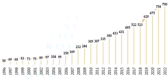 The increasing funding for research and development is reflected in the number of published scientific papers in the field. According to the Web of Science [], there were 8668 publications that included the keywords “Biosurfactants” and/or “Biosurfactant” published between 1996 and 2022. Figure 4 displays the trend of the constantly increasing interest of scientists in the topic of biosurfactants.