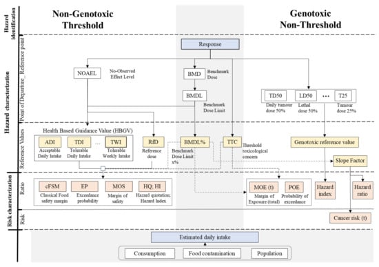 Risk characterisation is the final step in risk assessment and results from the combination of hazard characterisation and exposure assessment. It is defined as the qualitative and/or quantitative estimation of the exposure assessment and the severity of known or potential adverse health effects in a given population []. Ratio metrics are applied to assess the risk of non-genotoxic effects, e.g., the hazard quotation, while there are two options for genotoxic effects: to estimate the probability of developing cancer or to assess a ratio, e.g., the margin of exposure (MOE), Figure 1.