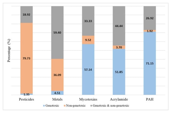 A total of 348 articles were selected, of which 74 dealt with pesticides, 133 with metals, 63 mycotoxins, 27 acrylamide, and 51 with PAHs. The search strategy was conducted according to the Cochrane protocol [], in which the best keywords and synonyms were found using MeSH terms and checking keywords in relevant articles and review papers. These terms were used to retrieve all the related articles in the Scopus, Google Scholar, PubMed, and ISI Web of Science international databases. The title, abstract, and keywords were used to apply the selection criteria to the articles published between 2015 and 2022.