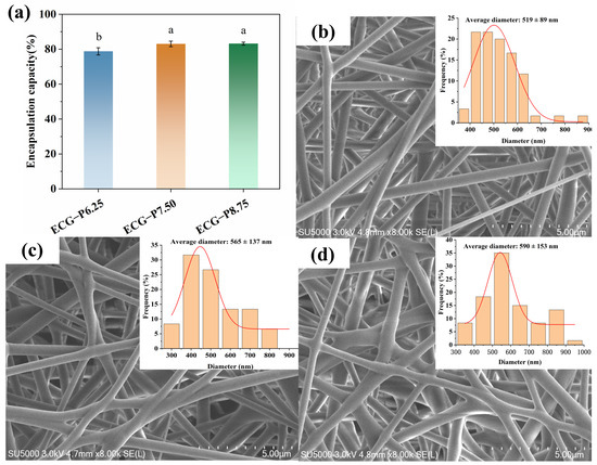EE of PSPAs into different films (a); SEM spectra of ECG−P6.25 (b), ECG−P7.50 (c) and ECG−P8.75 (d), respectively. The same lowercase letters represent no significant difference (p > 0.05).