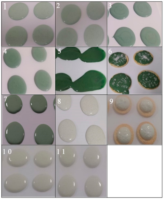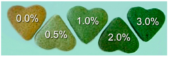 Chlorella vulgaris is sold as a food supplement, an additive [117,118], a food color, and an emulsion for food products [119]. The textural features of the biscuits were improved, and the color and texture were stable for three months, as previously reported for Chlorella biscuits [120]. When the biomass content was increased from 1.0 percent to 3.0 percent, the biscuits changed from a brownish to a green and duller tone (Figure 2).