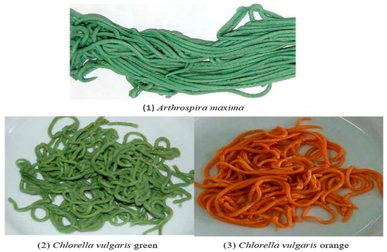 Pasta incorporated with (1) Arthrospira maxima, (2) Chlorella vulgaris, and (3) Chlorella vulgaris orange [118].