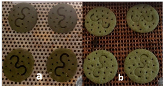 Functional biscuits with 4% A. platensis and different amounts of oil, sugar, and flour between (a,b) [27].