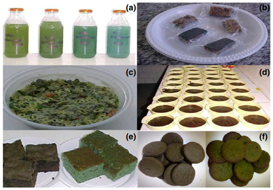 Food enriched with Arthrospira sp.: (a) isotonic beverages, (b) cereal bars, (c) instant soups, (d) pudding, (e) cake powder mix, and (f) biscuits [123].