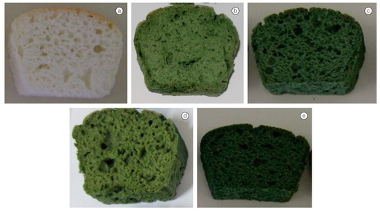 Gluten-free bread produced using rice flour: (a) control and with addition of (b) 2%, (c) 3%, (d) 4%, and (e) 5% Arthrospira platensis [126].