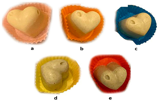 White chocolate samples: (a) control, and (b) 0.5%, (c) 1%, (d) 2%, and (e) 4% Arthrospira-containing samples [128].