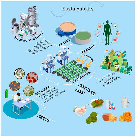 The desire for nutritious and useful foods has prompted the exploration of new food categories to supplement the typical diet and the discovery of more holistic approaches to disease prevention and treatment [10,17]. Microalgae have received remarkable attention for the use of their biomass to develop multifunctional food products that are beneficial to human health.