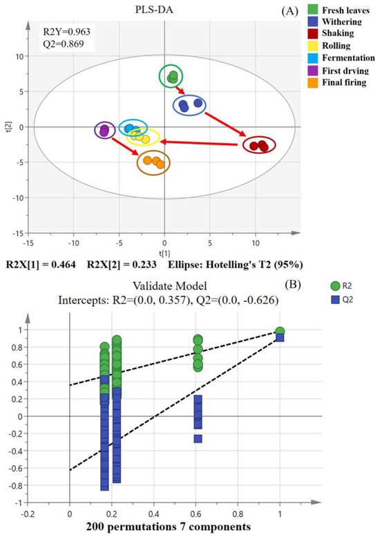 PLS-DA of SFABT over the entire manufacturing process via the GC-E-Nose. (A) Scores of PLS-DA (R2Y = 0.963 and Q2 = 0.869). (B) Cross-validation by a 200-fold permutation test (R2 = 0.357 and Q2 = −0.626).