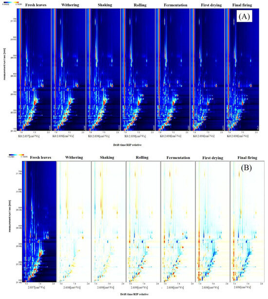 In order to facilitate the identification of volatile components and their variation regularity in SFABT during the manufacturing process, the technique known as GC-IMS was employed to extract comprehensive IMS insights from the examined samples. The volatile components in SFABT are shown via topographic plots (Figure 2A), with the ordinate signifying the retention time, and the abscissa capturing the ion migration time [15]. A red vertical line positioned at abscissa 1.0 represents the reactive ion peak (RIP), which has been pre-normalized. The background of each topographical profile is rendered in pristine blue, with the color signifying the intensity levels of the volatile compounds. Specifically, shades of red designate higher concentrations, while white demonstrates diminished levels. The deeper the shade, the higher the signal intensity. To facilitate visualization and comparative analysis, a spectral diagram obtained from fresh leaves was chosen as the benchmark, and the corresponding spectrum displayed by processed tea samples was deducted from the referential data. If a specific volatile compound remained consistent, the post-deduction background would appear white. The presence of red and blue implies that the concentration of certain volatile components was either heightened or reduced relative to the reference sample. Most of the signals were distributed in a retention time of 100–400 s and a drift time of 1.0–1.8. It is evident from Figure 2B that certain compounds diminished in SFABT as the processing phases progressed, and novel substances emerged, likely owing to the intricate biological and chemical mechanisms inherent in the fabrication process [6].