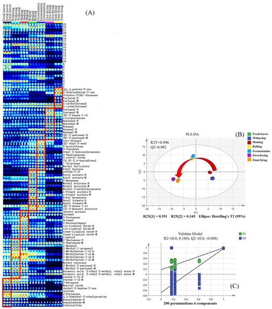 Although the topographic plots showed tendencies of the volatile compounds, accurate judgment regarding specific components was challenging. The fingerprint is an effective way of addressing this problem, where each row depicts the complete signal peak of a single sample, and each column denotes the identical components across disparate samples. The content is signified by the color code of the square—the brighter the color, the higher the content. Known components are denoted with their existing names, whereas unidentified components are labeled with numbers. As depicted in Figure 3A, there was an appreciable enrichment in the contents of pentan-1-ol monomer (#68), benzaldehyde dimer (#21), and ethylsulfide (#80) in fresh leaves, as compared to their concentrations in the remaining processed stages. In the withering stage, the concentration levels of 2-heptanone (#31, #35), 2-methyl-1-propanol (#82), n-hexanol (#97), 2-methylbutan-1-ol monomer (#92), 3-methylbutan-1-ol dimer (#79), methyl valerate (#77), 2-methyl-2-pentenal (#76, #81), and butanoic acid, 2-ethyl-3-methyl, ethyl ester dimer (#15) exceeded those in the other stages. The contents of methyl acetate (#66), butanal (#64), 3-pentanone (#83), octanal (#42), 2-butoxyethanol (#32), cis-linalool oxide dimer (#8), and trans-linalool oxide (#4, #5) were clearly enhanced in the shaking stage, albeit being relatively lower in the initial two stages. Their contents tended to decrease in subsequent stages. Concerning rolling, esters such as butyl acetate (#89, #100), methyl butyrate (#84, #88), methyl 3-methylbutanoate (#87), ethyl hexanoate (#44), and hexyl formate dimer (#24) were observed to be elevated in the rolling stage compared to the other processed samples. Significantly elevated levels of tert-butanol (#96), (E)-hept-2-enal (#33), 2-acetylfuran (#29), α-fenchene (#27), ethyl 3-hydroxybutanoate (#22), α-phellandrene (#19), 2-pentyl furan (#17), (E, E)-2,4-heptadienal (#12), γ-terpinene (#9), and methyl salicylate (#2) were observed during the fermentation process. Regarding the first drying stage, aldehyde compounds such as pentanal (#57, #58), heptanal (#25, #26), nonanal (#45), hexanal (#49, #50), and (E)-2-pentenal (#52, #53) were found to be more abundant in the first drying stage than in the other processed samples. It is hypothesized that the heating process could potentially enhance the degradation of fatty acids, subsequently generating the associated fatty aldehyde. For the final firing process, the contents of (E)-3-penten-2-one (#73), 3-hydroxybutan-2-one (#71), dihydro-2(3h)-furanone (#39), furfural (#47, #48), 2-methylbutanal (#59), and 3-methylbutanal (#60) significantly exceeded those observed at preceding stages. Principle compounds, including dihydro-2(3H)-furanone and furfural, are potentially derived from the associated Maillard reaction during the thermal process [29].
