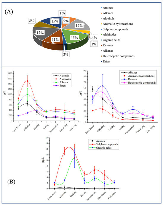 In terms of aldehydes, the highest content was observed during withering (1517.23 μg/L), followed by fresh leaves (841.45 μg/L), shaking (636.05 μg/L), fermentation (430.44 μg/L), first drying (402.30 μg/L), rolling (361.29 μg/L), and final firing (306.74 μg/L). The levels of alkenes, alcohols, ketones, heterocyclic compounds, and aromatic hydrocarbons exhibited analogous alterations. The content of esters exhibited an ascending trajectory from fresh leaves (194.64 μg/L) up to shaking (378.28 μg/L), and then showed a downward trend. The change trend of organic acids was the same as that of esters. The content of alkanes displayed a precipitous decrease from fresh leaves (58.02 μg/L) to rolling (8.44 μg/L), remaining constant in the subsequent stages. Sulfur compounds demonstrated an impressive augmentation by 8.5-fold (from 1.56 µg/L in fresh leaves to 13.26 µg/L in withering stage), which remained steady throughout the shaking stage. As the processing progressed, the level of sulfur compound drastically declined during the rolling stage (down to 5.37 μg/L), but subsequently, the content remained stable. We noted that the contents of amines displayed little variation throughout the entire process. Volatile constituents in the different categories showed different trends of change, potentially attributed to the release of volatiles arising from glycoside hydrolysis, carotenoid or lipid degradation, and the Maillard reaction during the manufacturing process [6,30].
