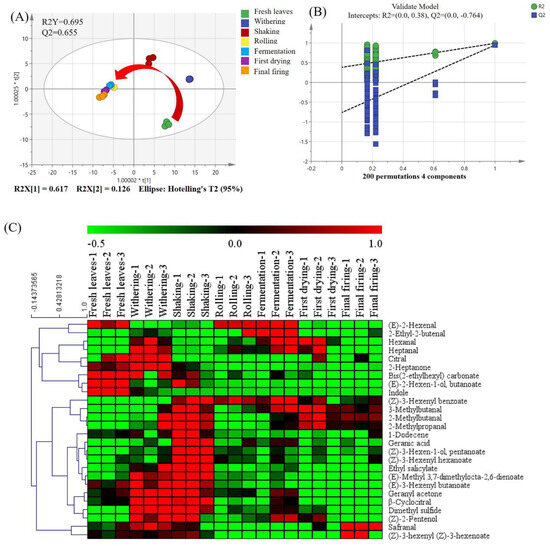 The results of multivariate statistical analysis obtained from GC-MS. (A) Scores of OPLS-DA (R2Y = 0.695 and Q2 = 0.655). (B) Cross-validation through a 200-fold permutation examination, yielding an R2 score of 0.38 and Q2 at −0.764. (C) Heat map analysis.