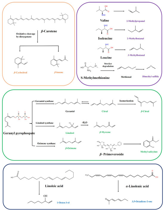 Within this array of pathways, β-cyclocitral and β-ionone were pivotal odorants derived from β-carotene degradation, which underwent enzymatic catalyzation by dioxygenases over the course of the fermentation process [6]. These CDVs predominantly impart unique floral and fruity odors.