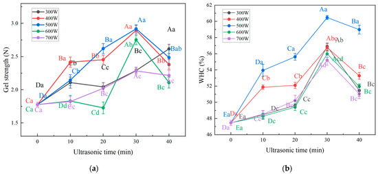(a): Gel strength of bovine plasma protein-carboxymethyl cellulose composite gel under different ultrasonic time and power. (b): WHC of bovine plasma protein-carboxymethyl cellulose composite gel under different ultrasonic time and power. Different superscript letters mean significant differences between values with different ultrasound power and ultrasound time (p < 0.05). Lower case letters indicate significant differences between different ultrasound powers. Upper case letters indicate significant differences for different ultrasound times. The samples without ultrasonic treatment (ultrasonic time 0 min) were the control samples.