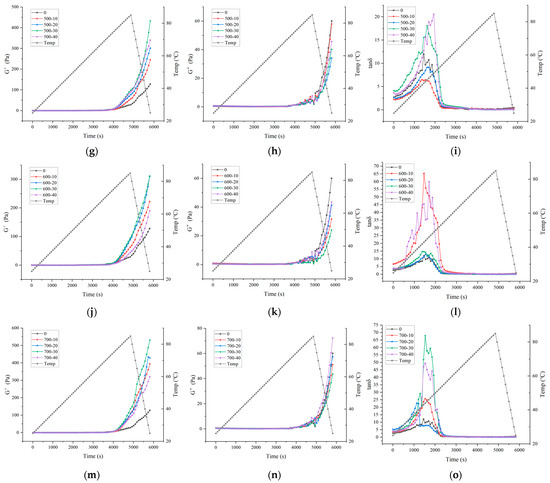 Thermal coagulation temperature gradient curves of bovine plasma protein-carboxymethyl cellulose composite gel at different ultrasonic power and time during heating and cooling. (a): Energy storage modulus at 300 W ultrasonic power. (b): Loss modulus at ultrasonic power 300 W. (c): Loss tangent at ultrasonic power 300 W. (d): Energy storage modulus at 400 W ultrasonic power. (e): Loss modulus at ultrasonic power 400 W. (f): Loss tangent at ultrasonic power 400 W. (g): Energy storage modulus at 500 W ultrasonic power. (h): Loss modulus at ultrasonic power 500 W. (i): Loss tangent at ultrasonic power 500 W. (j): Energy storage modulus at 600 W ultrasonic power. (k): Loss modulus at ultrasonic power 600 W. (l): Loss tangent at ultrasonic power 600 W. (m): Energy storage modulus at 700 W ultrasonic power. (n): Loss modulus at ultrasonic power 700 W. (o): Loss tangent at ultrasonic power 700 W.