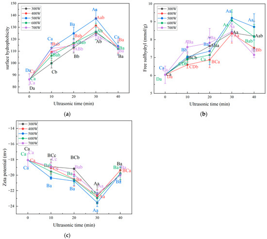 (a): Surface hydrophobicity of bovine plasma protein-carboxymethyl cellulose composite gel under different ultrasonic time and power. (b): Free sulfhydryl group of bovine plasma protein-carboxymethyl cellulose composite gel under different ultrasonic time and power. (c): zeta potential of bovine plasma protein-carboxymethyl cellulose composite gel under different ultrasonic time and power. Lower case letters indicate significant differences between different ultrasound powers. Upper case letters indicate significant differences for different ultrasound times.