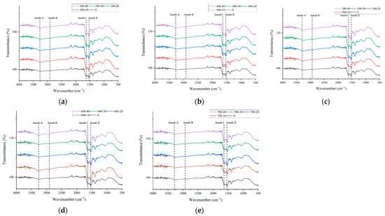 A Fourier transform infrared spectrometer detector (Tensor 27, Bruker, Germany) was utilized to analyze the secondary structure of the gels. A small amount of KBr was added to the freeze-dried samples, mixed, ground into powder, and compressed into a tablet using a tablet press. The parameters were configured as follows: wavenumber range of 4000–400 cm−1; resolution of 4 cm−1; and 32 scanning times. The background spectrum was recorded prior to measuring the sample [27].