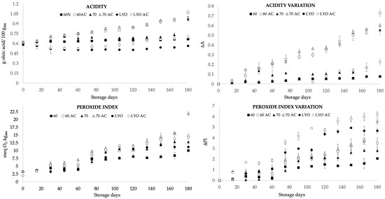 | Peroxides (meq/gdm) | 7.14 ± 0.08 a | 9.5 ± 0.4 c | 7.9 ± 0.1 b | 9.92 ± 0.02 a | 10.7 ± 0.5 b | 10.2 ± 0.7 b |