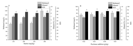 An appropriate ethanol level is inevitable to maintain the stability and flavor of fruit wine [24]. Considering the low sugar content of Maokui, the effects of additional sugar supplements were investigated by fixing the starter and pectinase usage at 200 mg/kg and 0.03 g/kg, respectively, at 28 °C (Figure 3C). The ethanol content in the wine increased as the total sugar elevated, and the highest ethanol content (9.42%, v/v) was obtained when the sucrose level was 18.3% (w/v). The methanol content remained almost unchanged when the total sugar was 14.9%. However, further sugar addition resulted in significant methanol elevation. The highest methanol content (227.8 mg/L) was observed when the total sugar was increased to 18.3%(w/v). In terms of SES, a remarkable difference was observed (p < 0.05) for sucrose addition.
