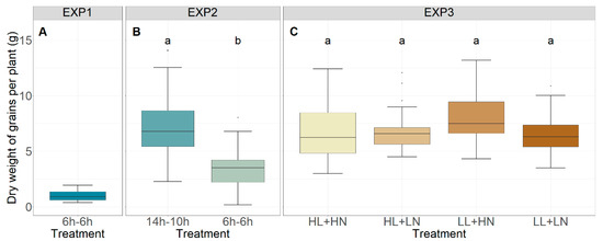 Total dry weight of grains per plant in EXP1 (A), EXP2 (B), and EXP3 (C). HL, LL, HN, and LN refer to ‘high light intensity’, ‘low light intensity’, ‘high nutrient concentration’, and ‘low nutrient concentration’, respectively. Different letters indicate statistical differences (p < 0.05) within the experiments.