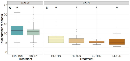 Total number of shoots for EXP2 (A) and EXP3 (B). HL, LL, HN, and LN refer to ‘high light intensity’, ‘low light intensity’, ‘high nutrient concentration’, and ‘low nutrient concentration’, respectively. Different letters indicate statistical differences (p < 0.05) within the experiments.