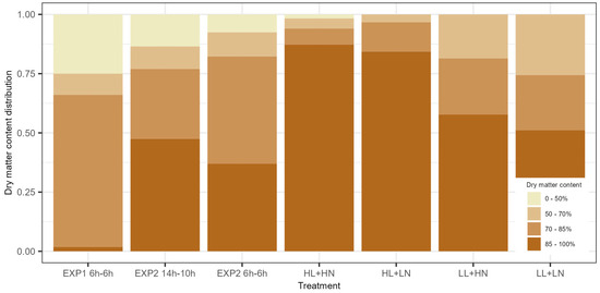 Across all experiments, grain quality was observed through the grains’ average dry matter content per ear. In EXP1, the 6 h treatment resulted in less than 2% of the ears having grains with an average dry matter content of >85% (Figure 4), while in general, the maximum moisture levels for safe storage are set at 14% [21]. In EXP2, the dry matter content distribution improved. Comparable dry matter content distributions were observed for the grains in both treatments, with less than 50% of the ears having grains with an average dry matter content higher than 85%. A clear difference in dry matter content distribution was observed between the high- and low-light-intensity treatments in EXP3. In the high-light-intensity treatments in EXP3, more than 80% of the ears had grains with an average dry matter content higher than 85%, while this was only slightly more than 50% in the low-light-intensity treatments.