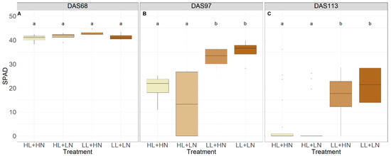SPAD of flag leaves for all treatments in EXP3 on different days after sowing (DAS) during grain filling and ripening: 68 DAS (A) (grain filling), 97 DAS (B) (grain filling and ripening), and 113 DAS (C) (ripening). HL, LL, HN, and LN refer to ‘high light intensity’, ‘low light intensity’, ‘high nutrient concentration’, and ‘low nutrient concentration’, respectively. Different letters indicate statistical differences (p < 0.05) within the experiments.