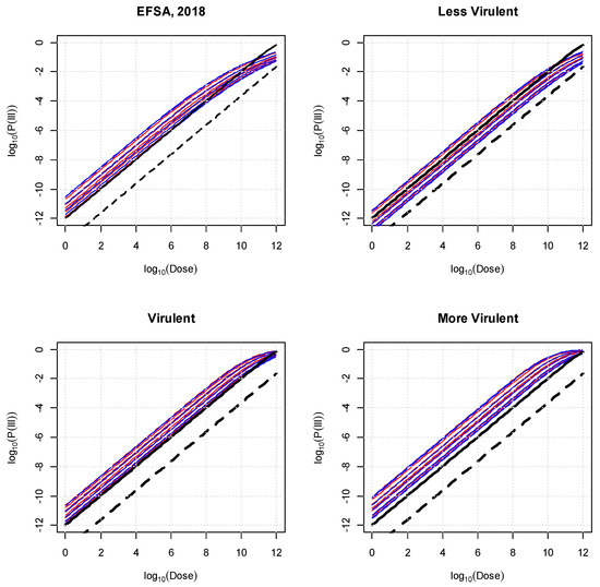 Figure 1 illustrates the DR curves for doses ranging from 1 to 1012 bacteria (as a mean of the Poisson dose) for the EFSA model [9] that are to be compared with the DR obtained in this study. The FAO and WHO [5] DR for the healthy population (exponential dose–response with parameter 1.06 × 10−12) and for the increased susceptibility population (exponential dose–response with parameter 2.37 × 10−14) are provided for comparison. As expected, the “more virulent” strains lead to a DR model that is shifted to the left when compared to the “marginal” model (EFSA, [9]) or, even more, the “less virulent strains”.