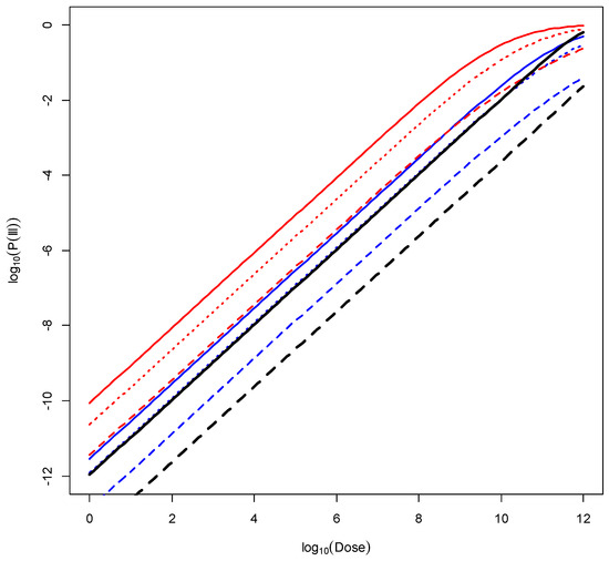 From Figure 1, and considering a dose of 103 bacteria, which lies within the linear part of the DR curves, for calculating the RR, the following observations can be made: for the FAO and WHO [5] model, the RR between the general and susceptible populations is 44.7, with the latter resulting in the higher probability of illness of 1.06 × 10−9.