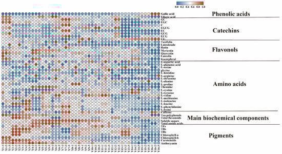 Adhering to national standards (GB/T 8313-2018) [19], the quantification of tea polyphenols at 765 nm was conducted using the Folin–Ciocalteu method with gallic acid as the standard, employing a UV-1100 ultraviolet-visible (UV-vis) spectrophotometer (Mapada, Shanghai, China). The total flavonoid content at 510 nm was determined using rutin as the standard. For assessing soluble sugar content, glucose was utilized as the standard, and the anthrone method at 620 nm was employed. According to national standards (GB/T 8314-2013) [20], L-glutamine served as the standard for measuring total amino acid content through a ninhydrin assay at 570 nm. The contents of theaflavins (TFs), thearubigins (TRs), and theabrownins (TBs) were analyzed by spectrophotometry according to Zhu et al. [21]. The anthocyanins content of the organic green tea samples was determined by ultraviolet spectrophotometer following the procedure of Amulya and Islam [22]. The chlorophyll-and total carotenoids of the organic green tea samples were extracted by the method of Xie et al. [23] and measured at 470, 645, and 662 nm to quantify the chlorophyll-and total carotenoids contents.