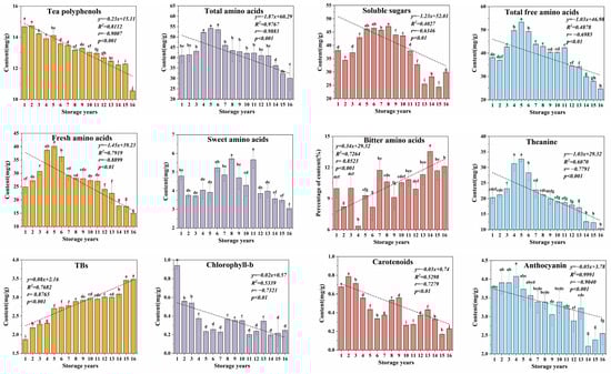The typical patterns of change in the representative components of organic green tea during long-term storage. Different letters represent significance at the level of p < 0.05.