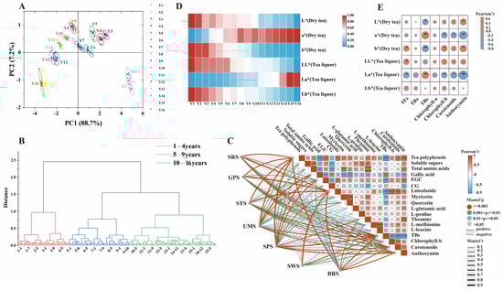 Taste and color changes in organic green tea during long-term storage based on electronic tongue and color differences. (A) PCA plots of taste change in organic green tea. (B) Hierarchical cluster analysis of organic green tea during long-term storage based on electronic tongue. (C) Correlation analysis between taste characteristics and important functional components. (D) Changes in color of dry tea and tea liquor of organic green tea. (E) Relationships between color difference values and tea pigments. **** p < 0.0001, *** p < 0.001, ** p < 0.01, * p < 0.05, Significant correlation.