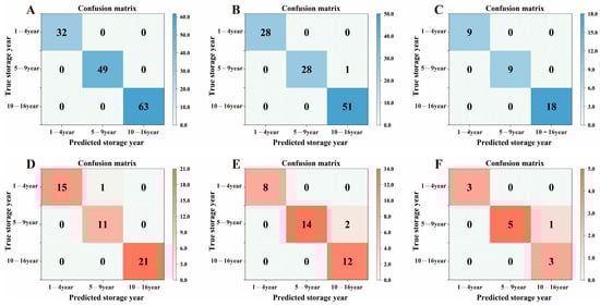 Confusion matrix for the BPNN discriminant model. (A) Training set based on electronic tongue. (B) Training set based on 10 compounds. (C) Training set based on color difference value. (D) Test set based on electronic tongue. (E) Test set based on 10 compounds. (F) Test set based on color difference value.